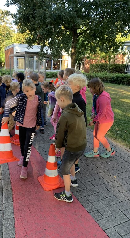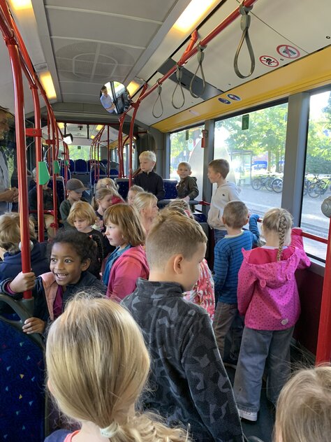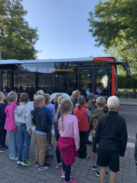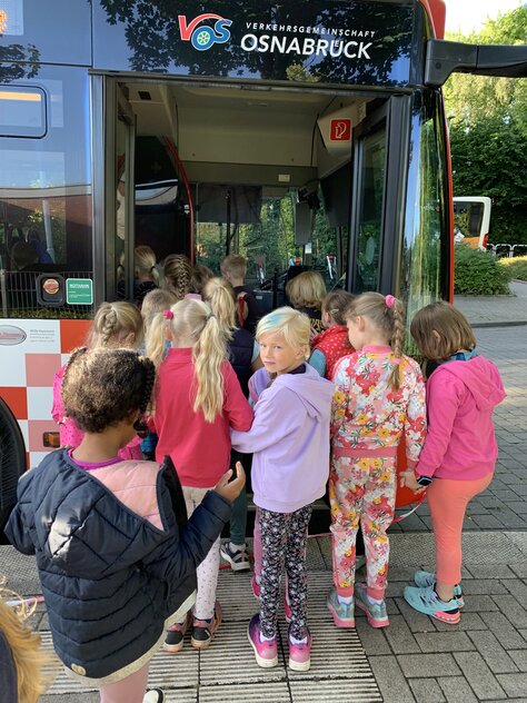 Auch dieses Jahr hieß es für unsere ersten Klassen wieder: die Busschule kommt! An unserer Bushaltestelle fuhr ein langer Linienbus des Busunternehmens Willy Hummert vor, der von dem Busfahrer Dominik gelenkt wurde. Dank der Hilfe von Frau Blum lernten die Kinder, wie man sich am Bussteig sicher verhält und was ein toter Winkel ist. Besonders eindrücklich war die kurze Fahrt durch Bad Laer, bei der auch das richtige Verhalten im Bus thematisiert wurde. Abschließendes Highlight der Stunde war wohl die Gefahrenbremsung, bei der die Kinder beobachten konnten, wie ein mit Wasser gefühlter Kanister quer durch den Bus schoss. Unsere Erstklässler*innen sind nun gut gerüstet für den ÖPNV. Vielen Dank an Frau Blum und Dominik!